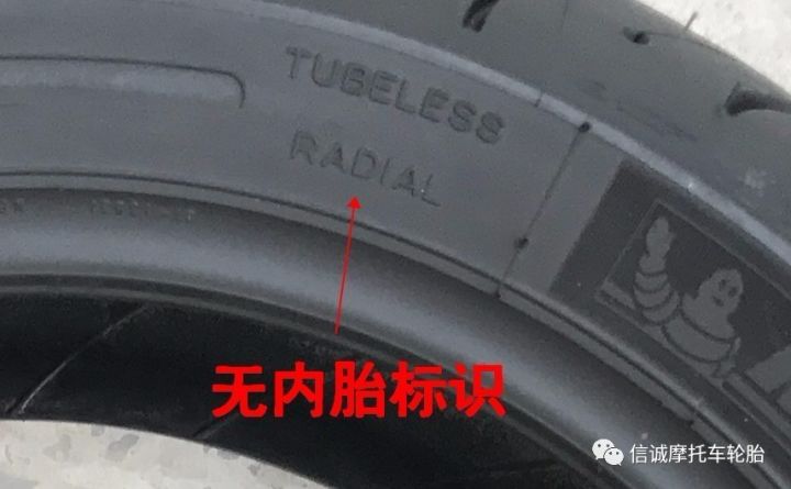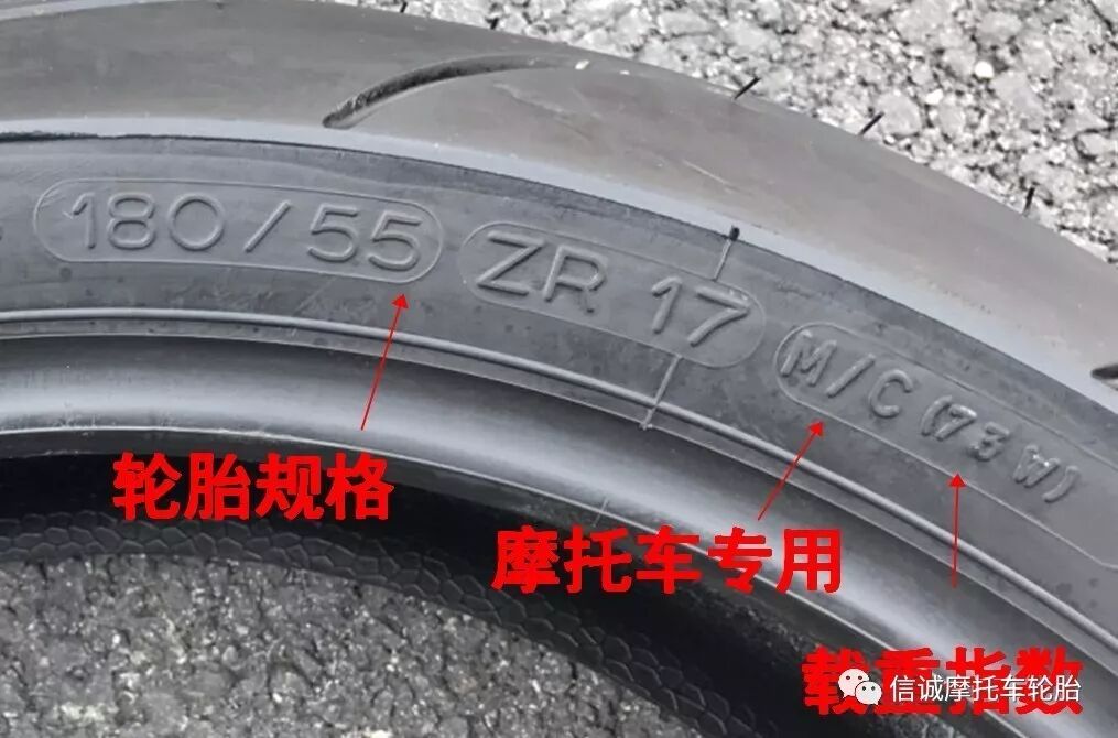 轮胎上的数字和字母标志,代表如上如所示 ↑ (举例:180/55ZR17 73W TL,其180/55为其轮胎的规格;而其ZR则代表子午真空胎;M/C是我们摩托车的专用标志用语;73为此款轮胎的载重指数,而其后面的W代表此款轮胎的可行驶的最高速度指数,TL则代表无内胎均可正常使用(如下张图片标示),相关的载重指数和速度指数可以上品牌的官方网上面去查对或咨询相关专业人士。
